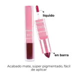 Diseño dúo: incluye labial en barra + producto líquido (o bálsamo, según variante).