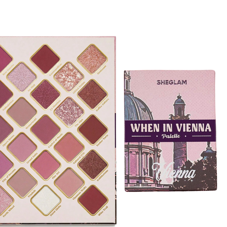La paleta When in Vienna de Sheglam reúne 23 tonos en una armonía de rosas, mauves y cobres que van desde mates aterciopelados hasta shimmers perlados. Inspirada en la elegancia de la capital austríaca, esta paleta es ideal para looks románticos, sofisticados o de impacto, adaptándose a todos los tonos de piel.