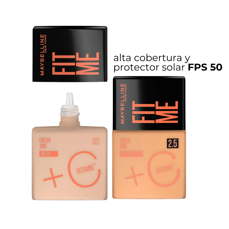 La base Fit Me Fresh Tint de Maybelline New York es una base líquida ligera con acabado fresco que combina cobertura natural, protección solar SPF50 y un plus de vitamina C para potenciar la luminosidad del rostro. Su textura liviana se funde con la piel para un efecto «buena cara» instantáneo y duradero, ideal para quienes buscan un look saludable y natural todos los días.