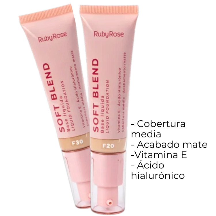 La base líquida Soft Blend de Ruby Rose está formulada para brindar un acabado natural matte y cobertura construible, perfecta para el uso diario. Enriquecida con vitamina E y ácido hialurónico, hidrata mientras embellece, dejando la piel suave, uniforme y con efecto aterciopelado.