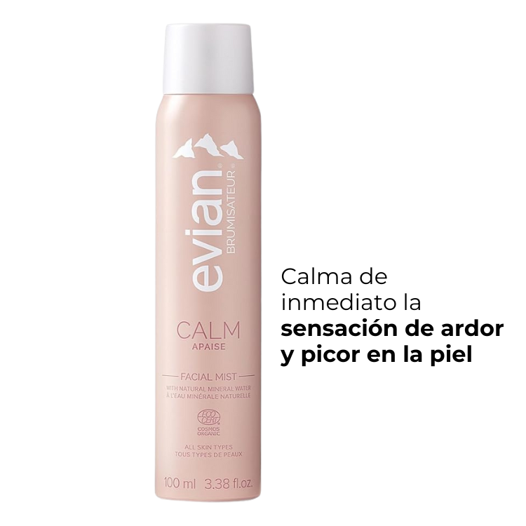 La bruma Calm de Evian sirve para hidratar, refrescar y calmar la piel del rostro, ayudando a equilibrar el pH, aliviar la tirantez y mejorar la textura cutánea. Puede usarse como parte de la rutina facial, para fijar maquillaje o como un shot de frescura durante el día.