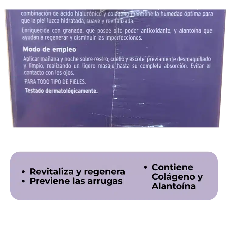 Crema hidratante que previene el envejecimiento prematuro de la piel. La combinación de ácido hialurónico y colágeno mantiene la humedad óptima para que la piel luzca hidratada, suave y revitalizada. Evita la deshidratación y ayuda a disminuir las imperfecciones.