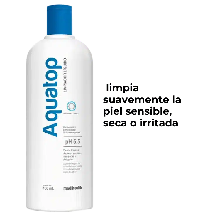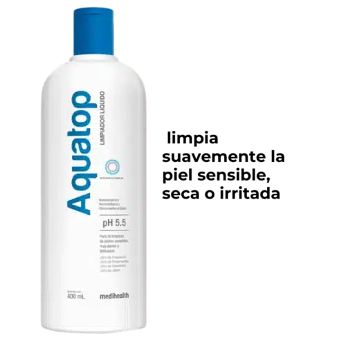El Limpiador Líquido Aquatop de Medihealth es un gel dermatológico sin jabón (syndet) formulado especialmente para limpiar suavemente la piel sensible, seca o irritada, respetando el equilibrio natural gracias a su pH fisiológico de 5.5. Ideal para uso diario en rostro y cuerpo, incluso en pieles con patologías dermatológicas como dermatitis, rosácea o piel atópica.