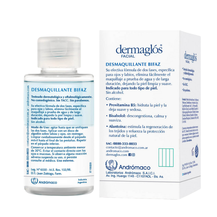 El Desmaquillante Bifaz de Dermaglós está formulado con una tecnología de dos fases que remueve incluso el maquillaje más resistente y a prueba de agua sin necesidad de frotar. Ideal para zonas sensibles como los ojos y labios, deja la piel limpia, suave y calmada desde el primer uso. No contiene alcohol, es hipoalergénico, libre de parabenos y ha sido dermatológica y oftalmológicamente testeado, siendo apto para todo tipo de piel, incluso pieles sensibles.