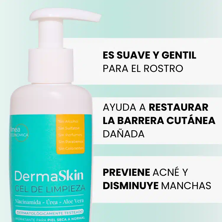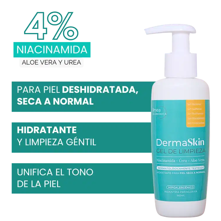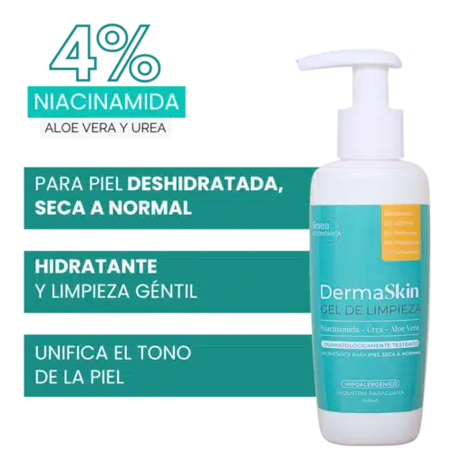 Gel de limpieza facial DermaSkin hidratante con 4% de Niacinamida, Urea y extracto natural de Aloe Vera, es ideal para pieles con barrera cutánea debilitada, pieles muy sensibles, deshidratadas, secas o normales.